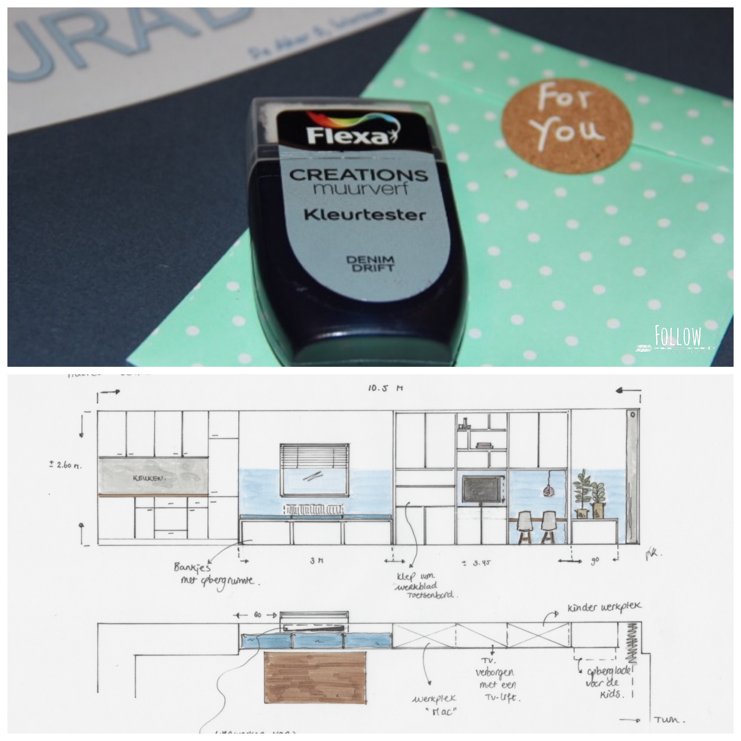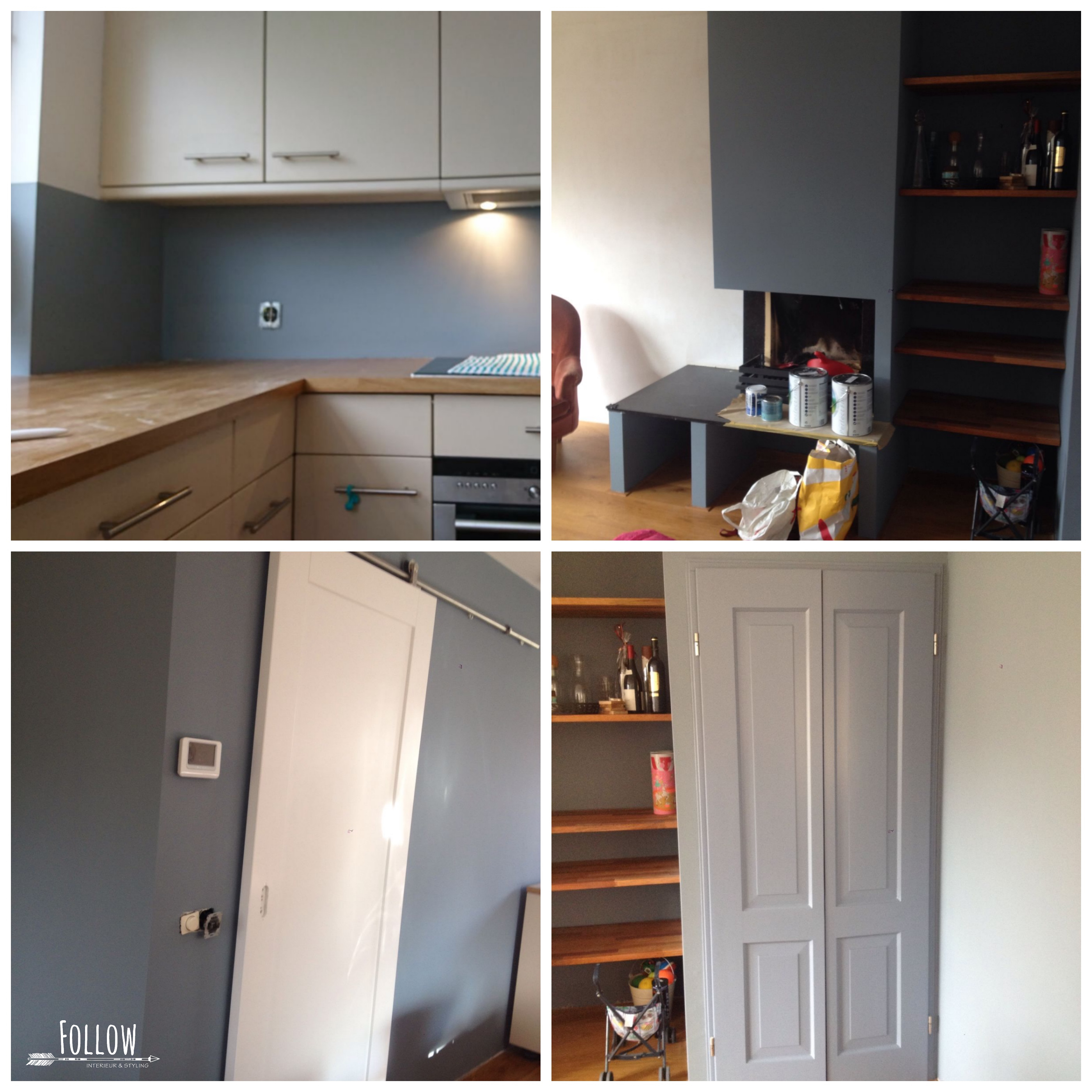 In de woonkamer is de eye-catcher de openhaard geschilderd in een stoere Denim drift van Flexa. naast de openhaard komt nog een fotoprint op behang van de bewoners hun favoriete plek ” Terschelling”. Om de doorloop van hal en woonkamer beter te laten verlopen heb ik gekozen om de deur te verplaatsen naar de lange wand. Aan de lange wand bevindt zich nu een schuifdeur, dat zorgt voor een ruimtelijk effect.