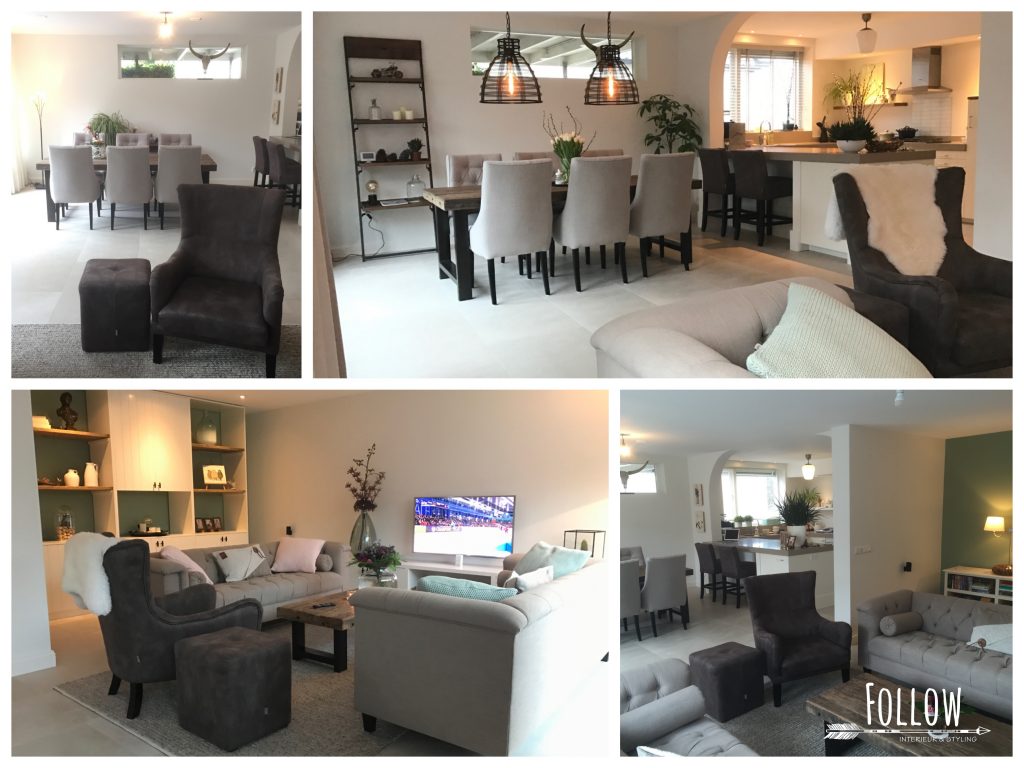 Belangrijke wens van de klant was dat er een opberg/sfeerkast zou worden geplaatst. Dit was voor mij een belangrijke uitgangspunt. De keuze voor een combinatie van stoer landelijk met grijs/blauwe en aarde tinten waren al snel gemaakt. Om het geheel spannender te maken koos ik voor zwart ijzer dat je terug ziet in de lampen en tafelpoten. Door met warme materialen te werken zoals hout wordt het geheel sfeervoller. Om de ruimtes rustig te houden heb ik gekozen voor een opbergkast op maat gemaakt met open vakken en een lang televisiemeubel in wit hout. Dit is stoer en landelijk tegelijk.